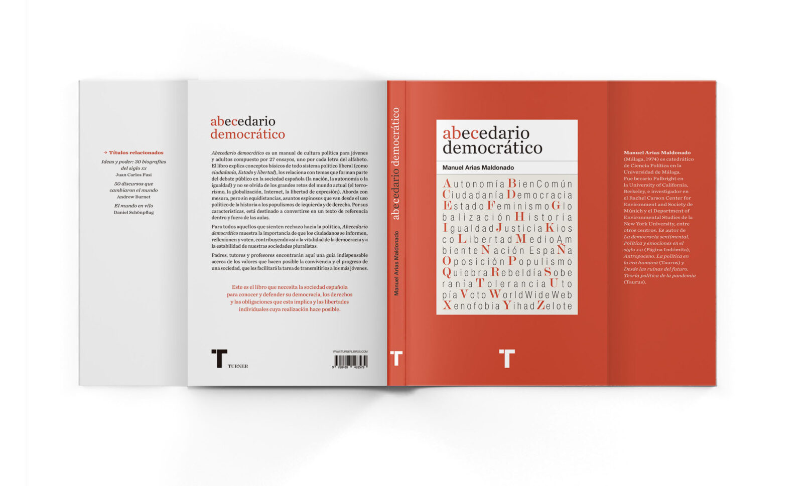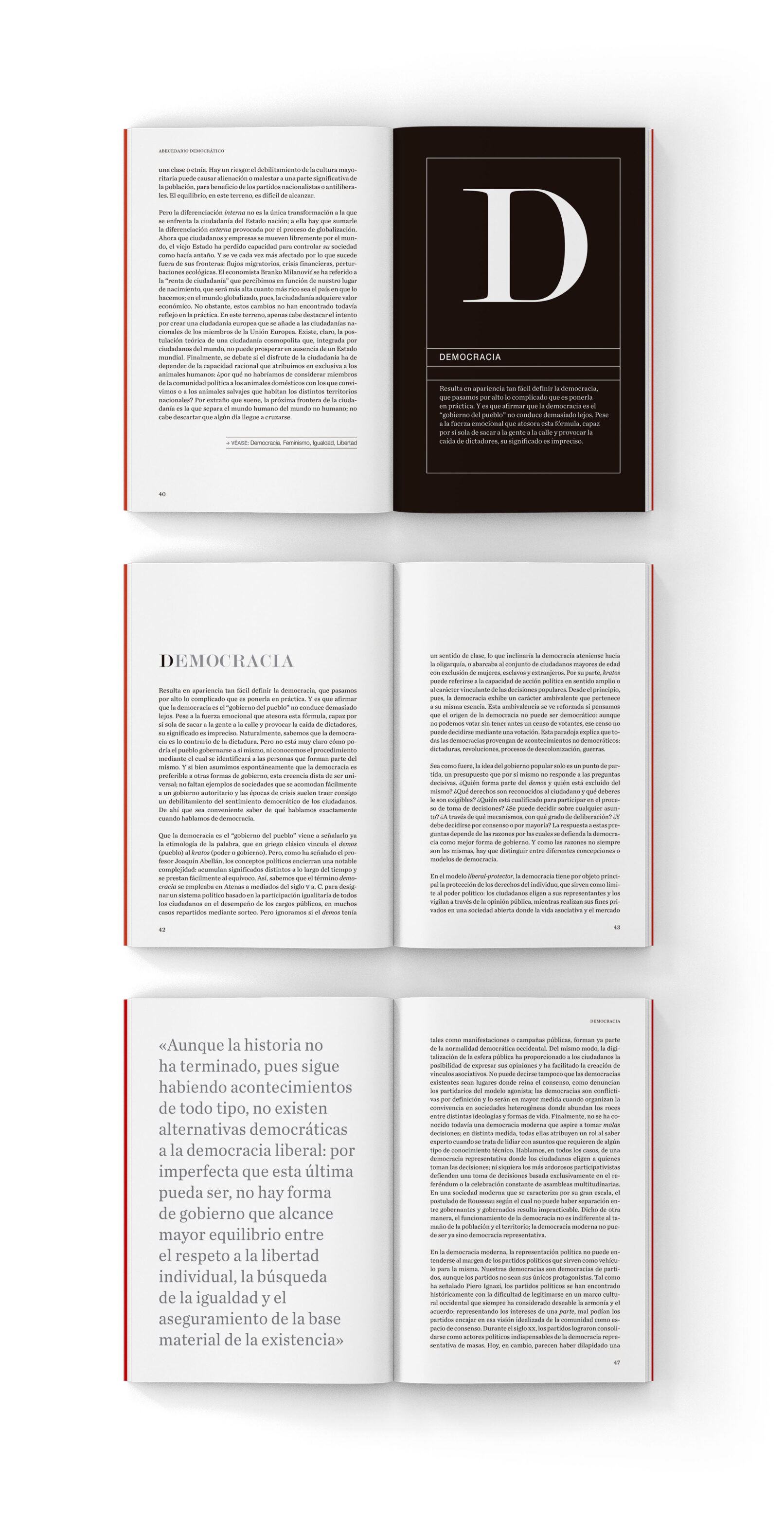 La propusimos a la editorial, y se inició el proceso de producción, en el que de nuevo intervenimos en la selección del contenido en un principio y, sobre todo y más adelante, en el diseño y maquetación del libro. Tanto en la cubierta como en los interiores procuramos resaltar la particularidad del “abecedario conceptual”, dando importancia tipográfica las letras del alfabeto. En la cubierta con un tratamiento sobrio, pero también contundente, en el que queda claramente plasmado lo peculiar de la propuesta. En el interior con unas portadillas en las que la letra correspondiente toma gran protagonismo.
