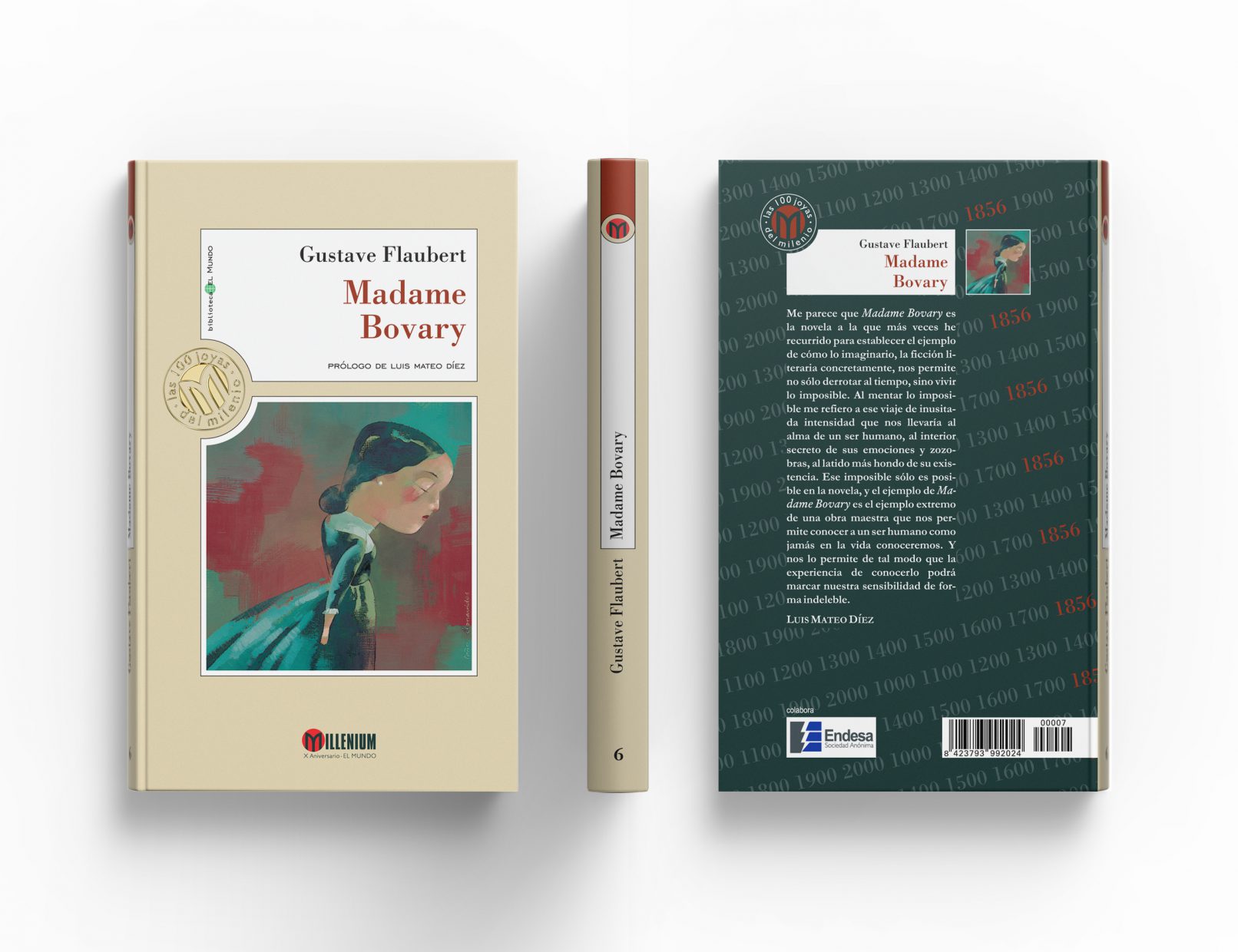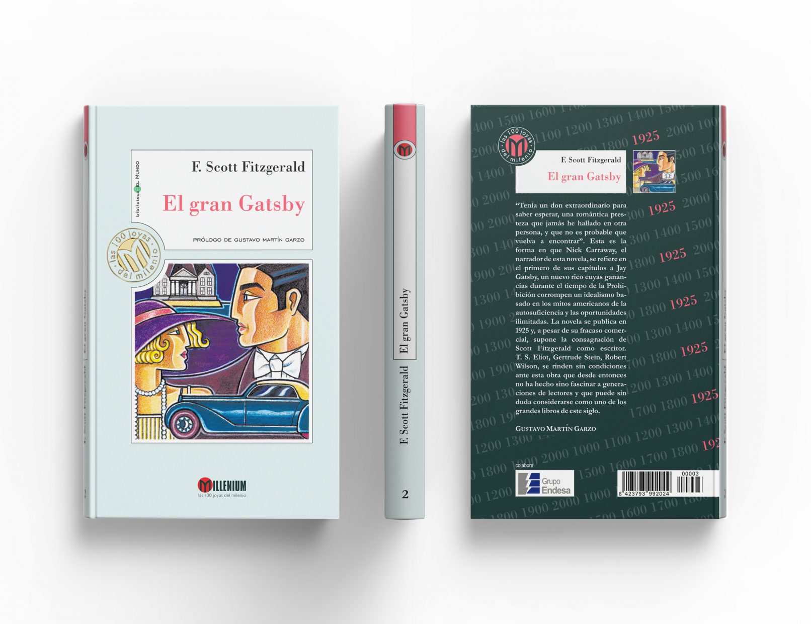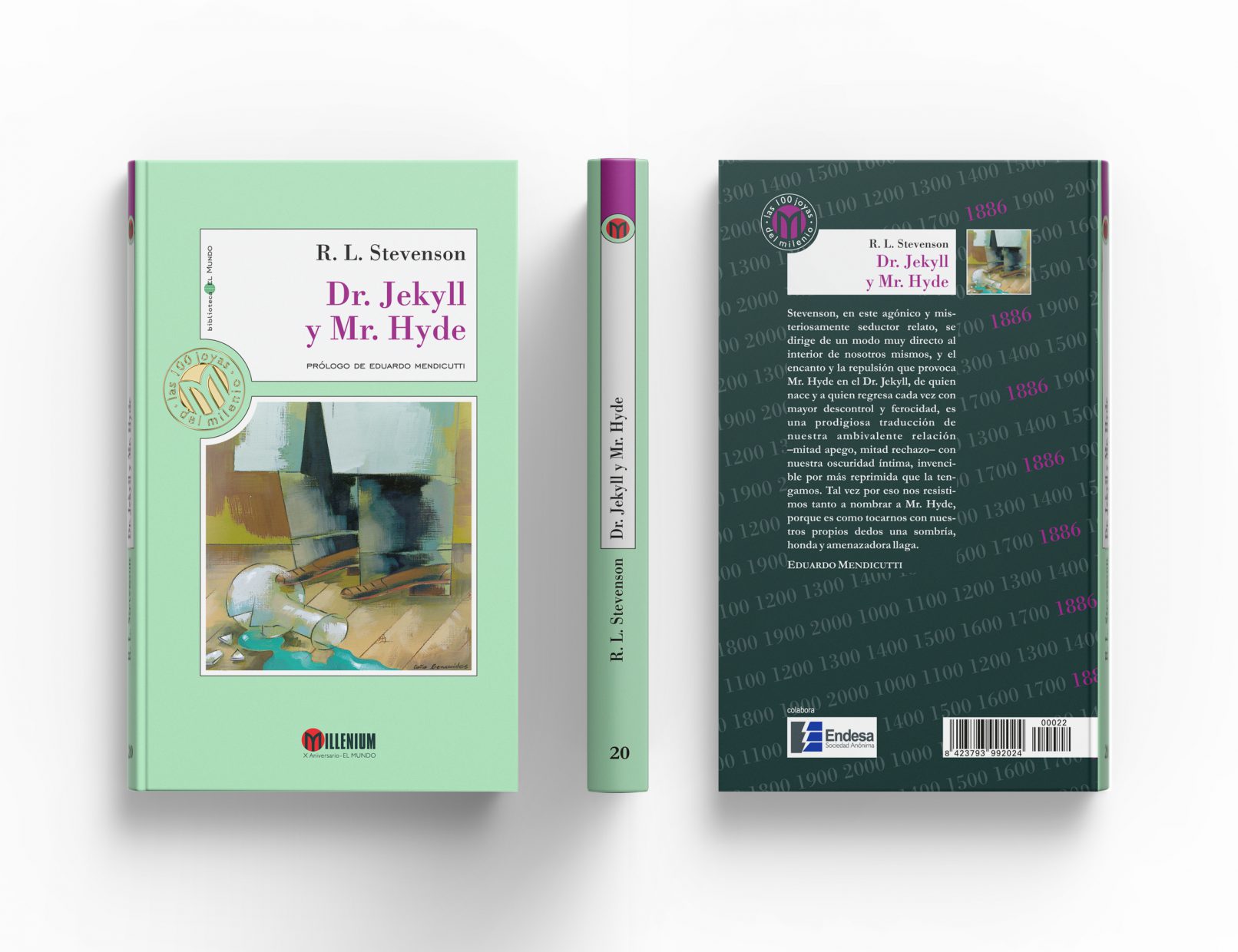 Creamos un logotipo en el que la M del nombre de la colección, Millenium, asemeja un libro abierto y es el centro del sello que, a modo de bisagra, se sitúa entre la cartela que contiene autor, título y prologuista y la caja que contiene la ilustración. Por detrás de estas ‘etiquetas’ los fondos de los libros tienen siempre tonos pastel.