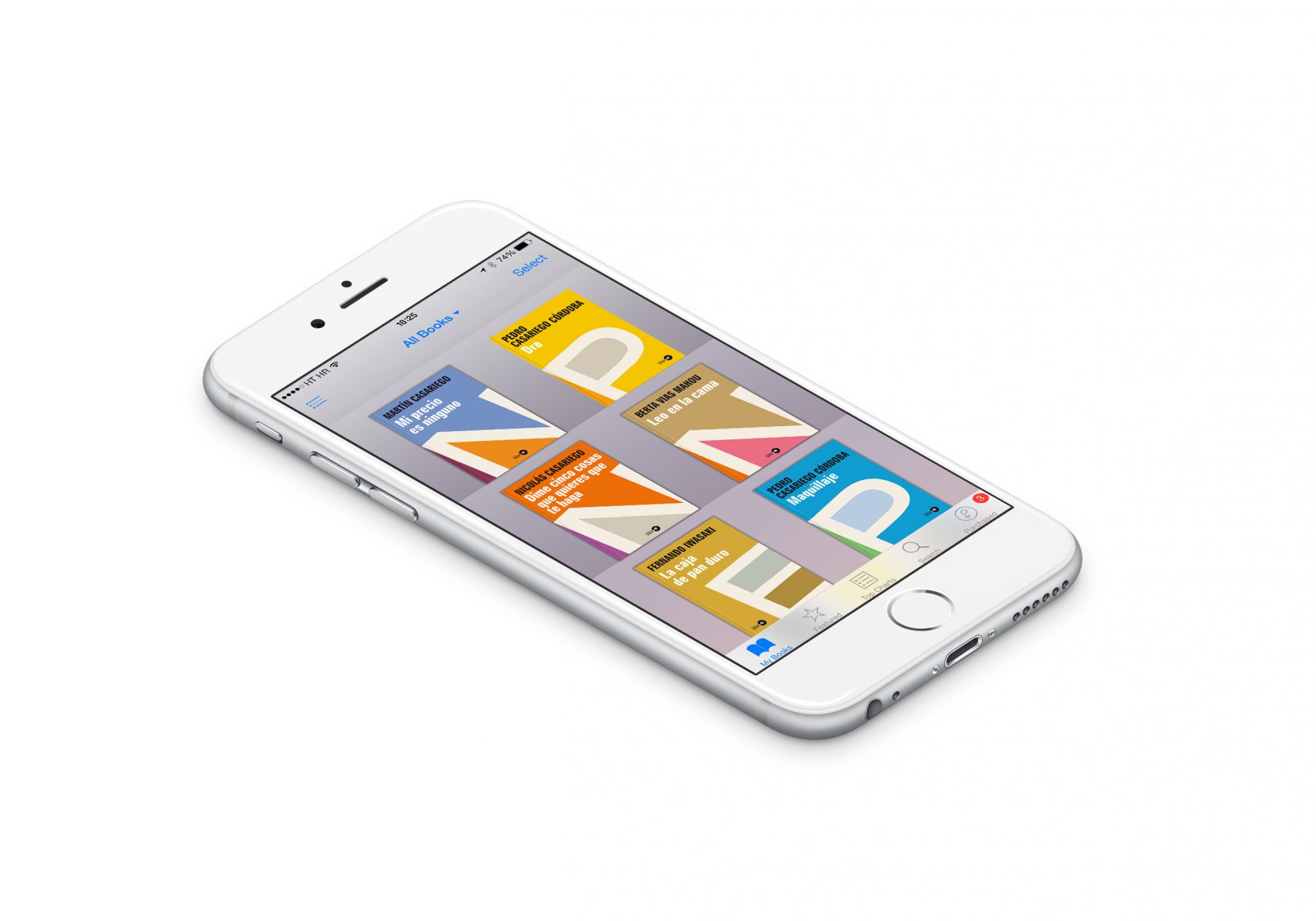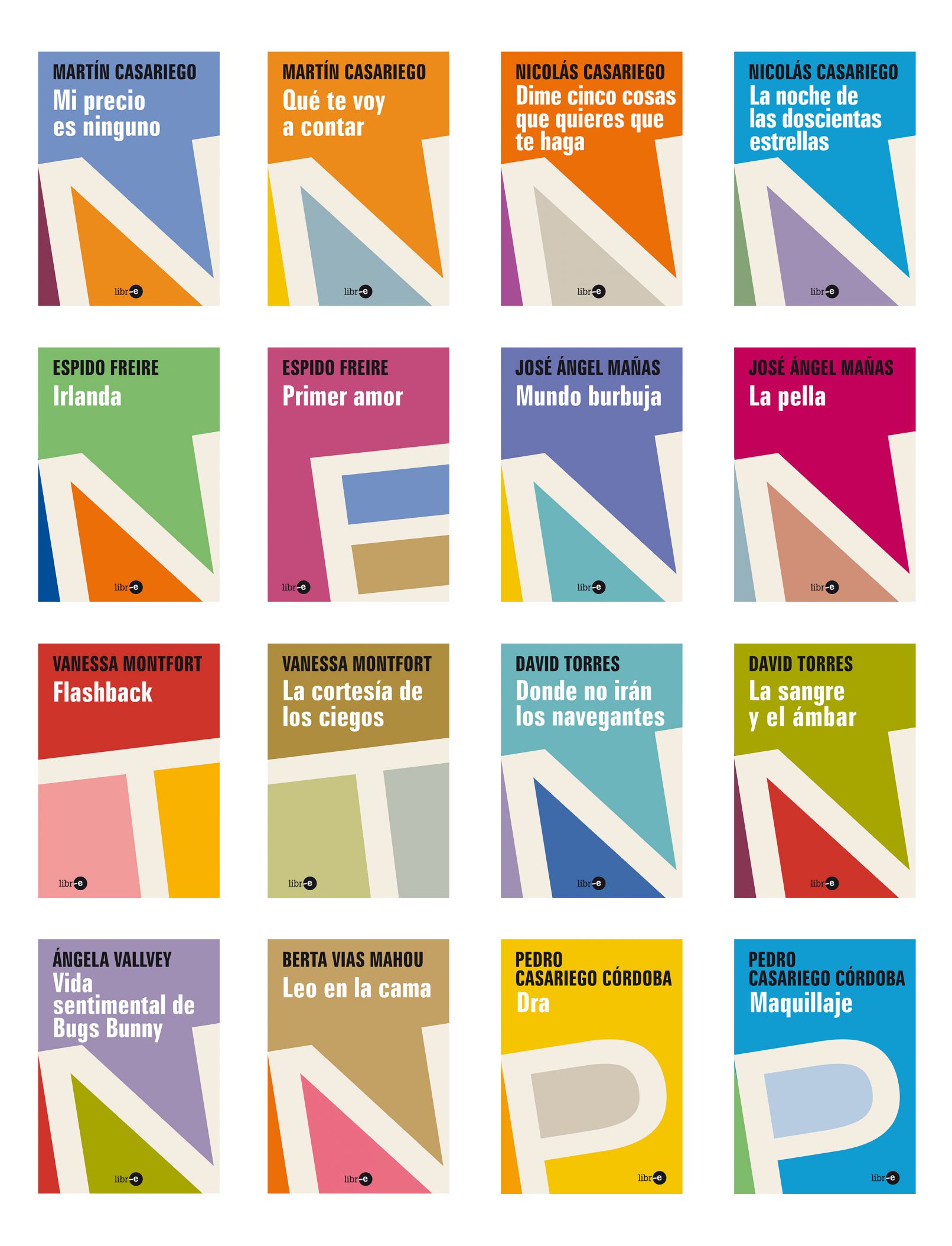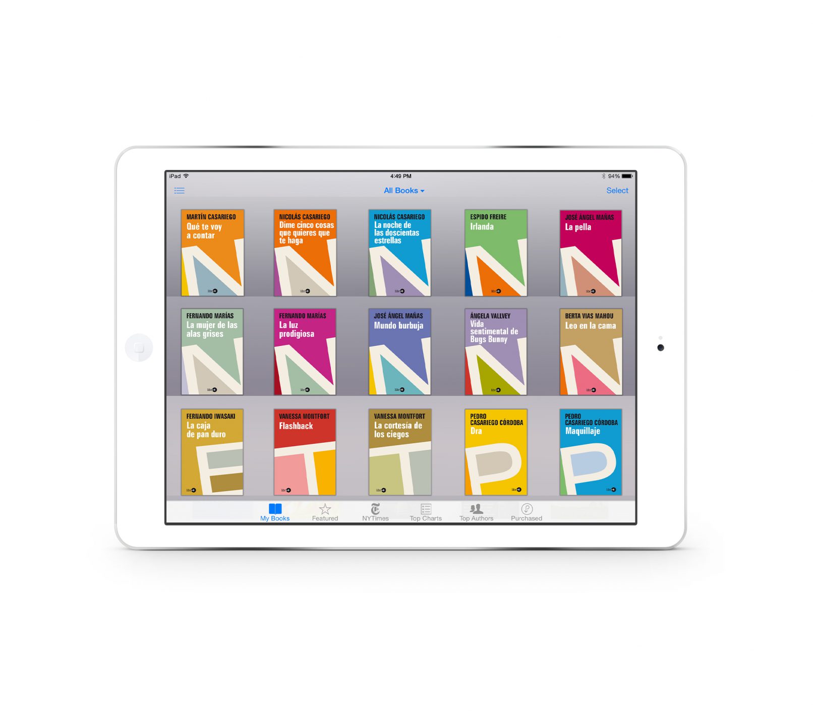 El siguiente reto fue diseñar unas cubiertas en las que se reflejara con potencia el concepto de colección. También queríamos que los nombres de los autores y los títulos se vieran bien a escala reducida y en una pantalla (sea a la hora de adquirir el libro en la página web, sea en la biblioteca del dispositivo de lectura), y que al primer vistazo se supiera si se trataba de una novela, obra de teatro, ensayo o poesía. El elemento vertebrador fue la letra inicial de cada una de esas categorías, que divide la cubierta en sectores de diferentes colores y sirve de apoyo a los textos.