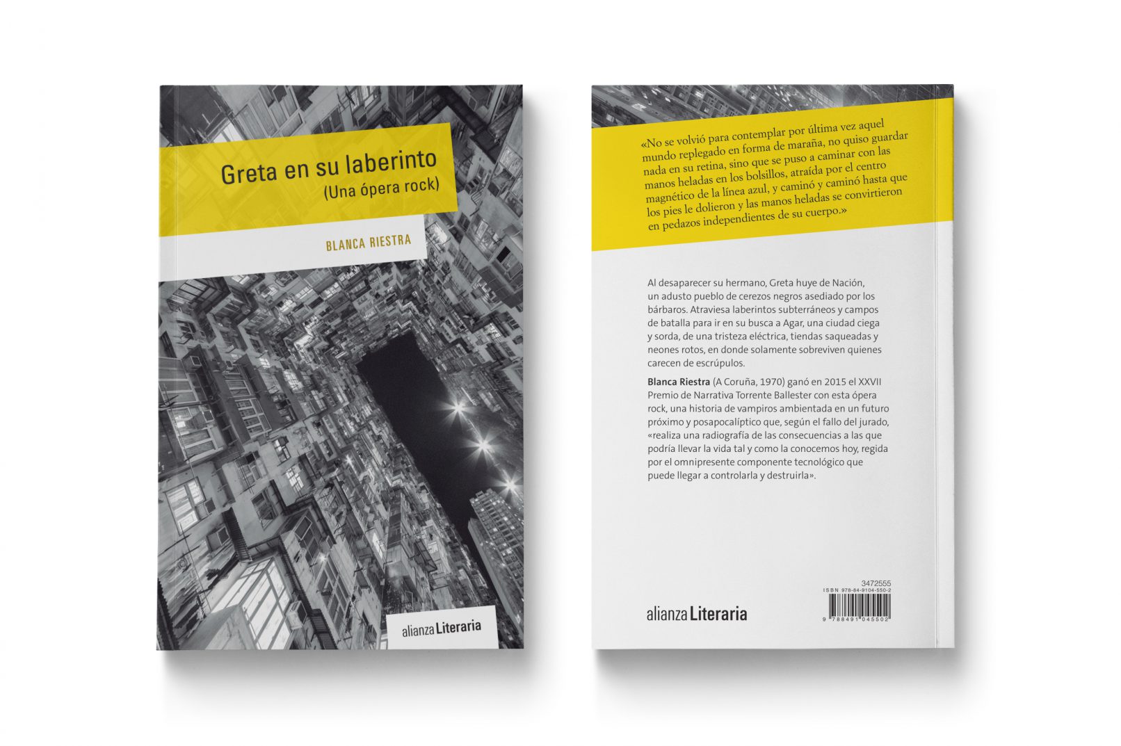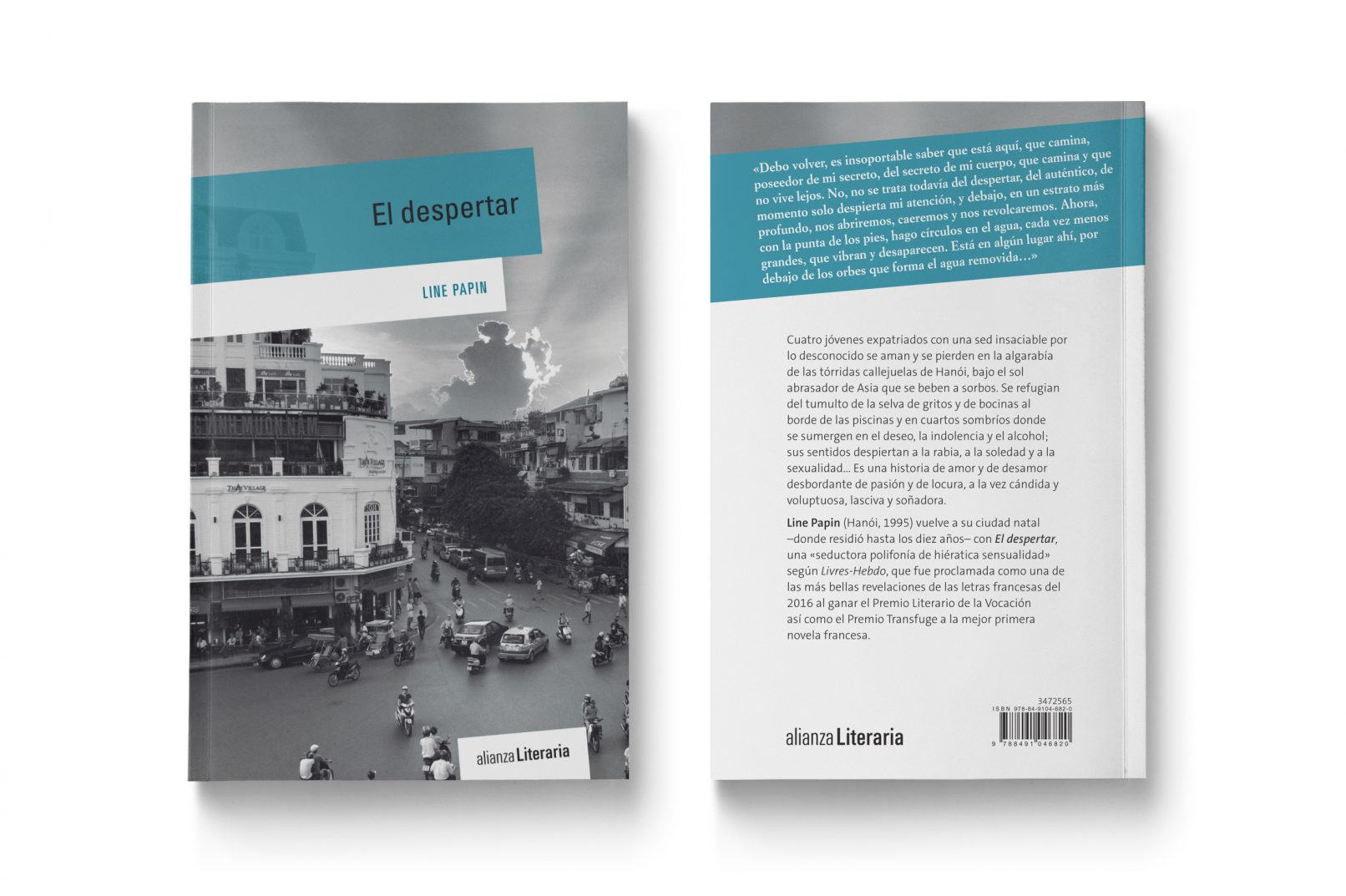 Es una colección de novela de bolsillo que quiere dar a conocer a autores jóvenes (nuevas voces), por lo que Alianza nos pidió que la imagen fuese también moderna. Eso se consigue con el color llamativo de la banda en la que va el título del libro, y sobre todo por su inclinación, que continúa en lomo y trasera. Al ser muy potente la oferta de libros de ensayo en esta editorial, la idea de que estamos ante obras de narrativa se refuerza con la fotografía en blanco y negro del fondo, que elegimos nosotros.