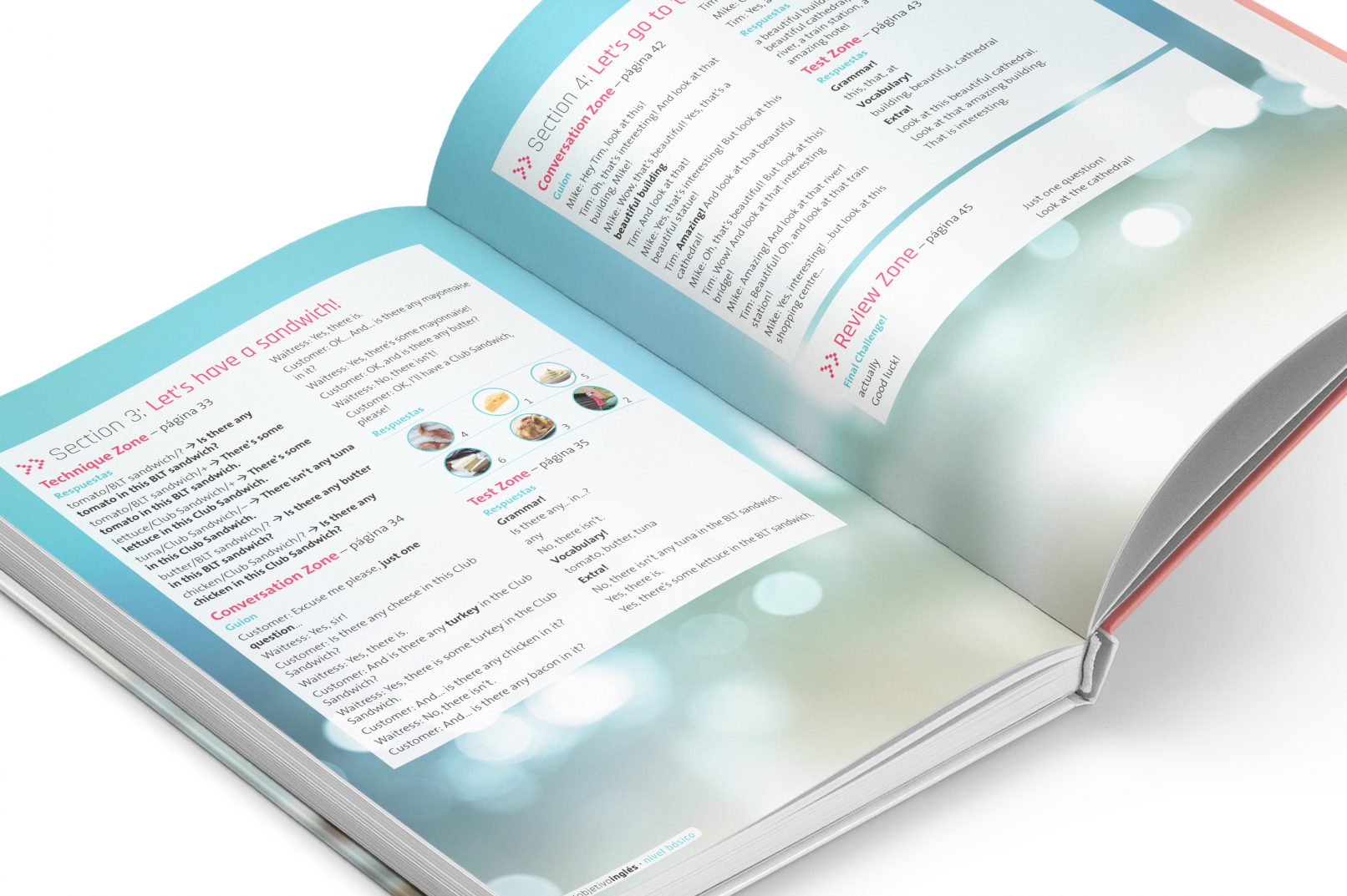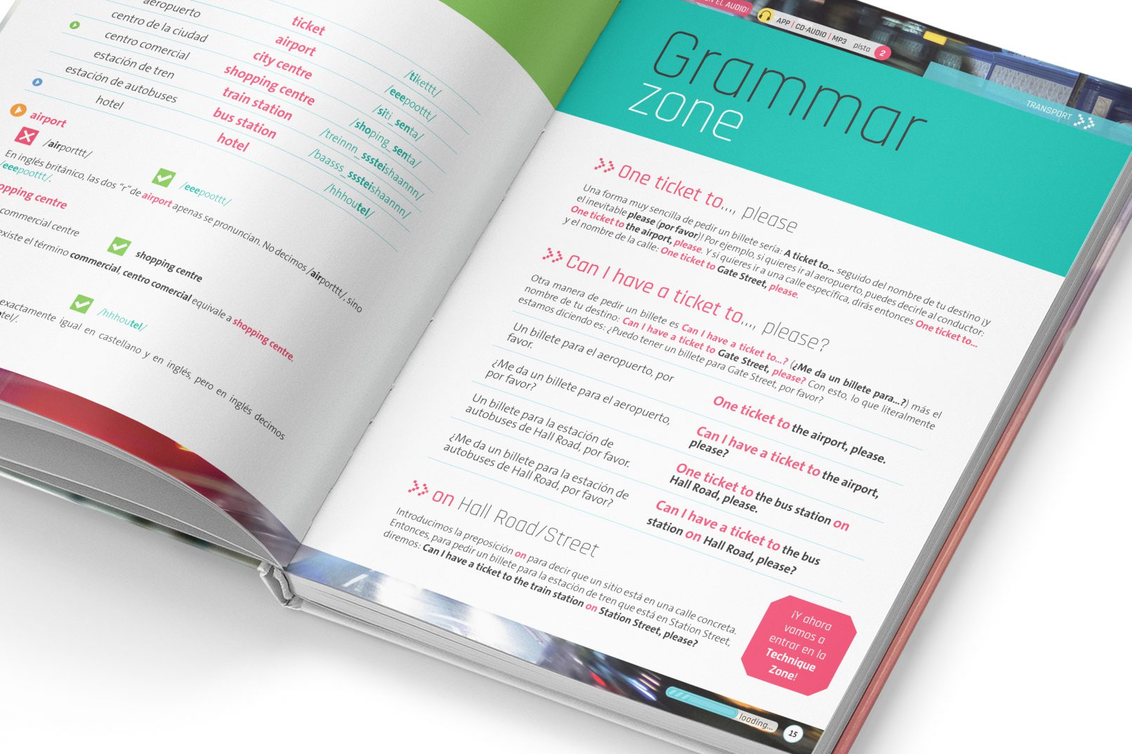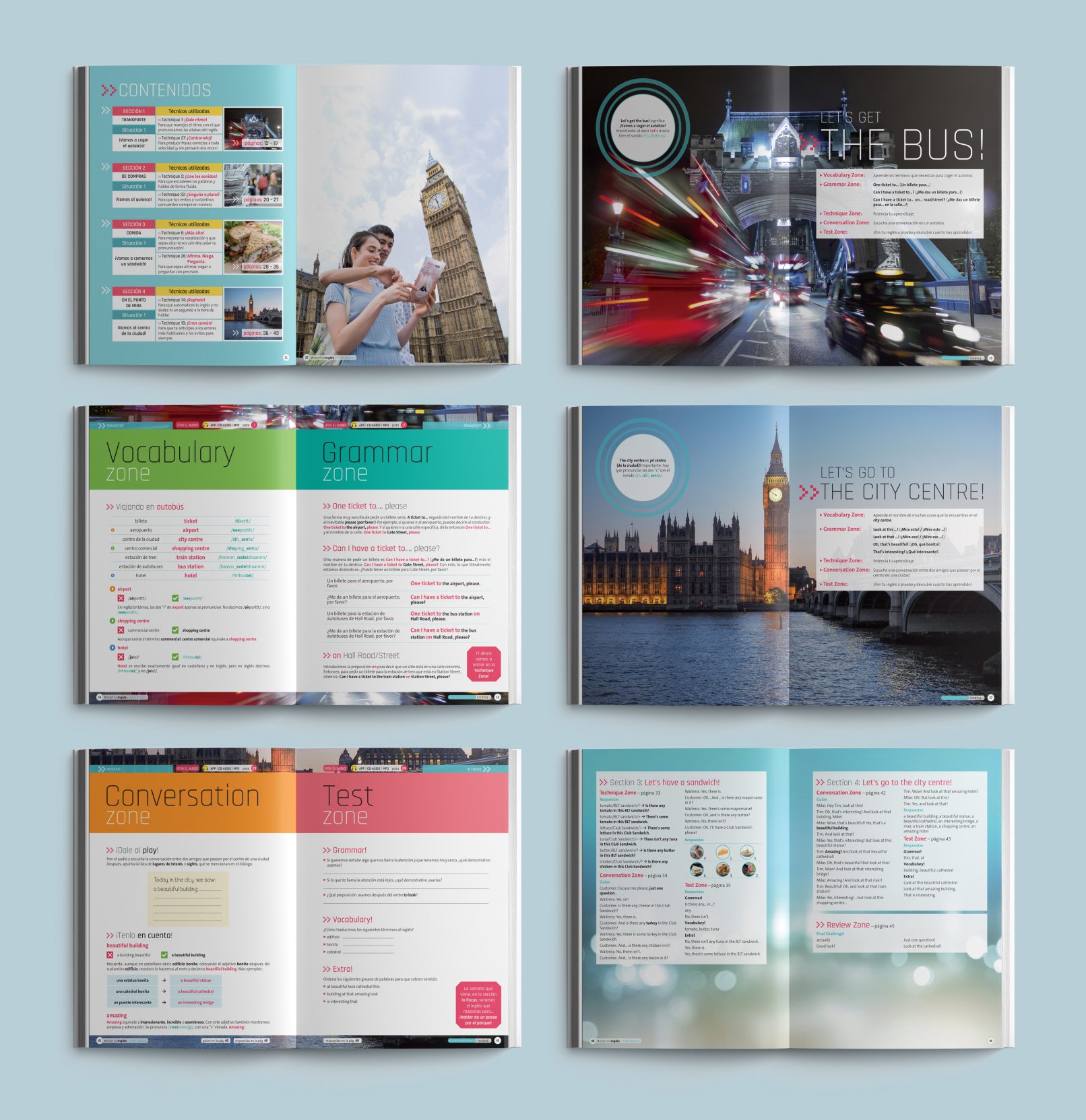 Los interiores están estructurados en «situaciones» con 5 secciones o «zonas» cada una (Vocabulary, Grammar, Conversation, Test y Technique zones). Las situaciones están introducidas por una doble página con una foto a sangre, y las zonas tienen una cabecera con mucha fuerza que las diferencia claramente. En el diseño priman esa idea de fuerza, y también de claridad, que se han podido conseguir, en parte, porque el contenido está más condensado que en otros cursos en los que hemos trabajado con Vaughan y El Mundo.