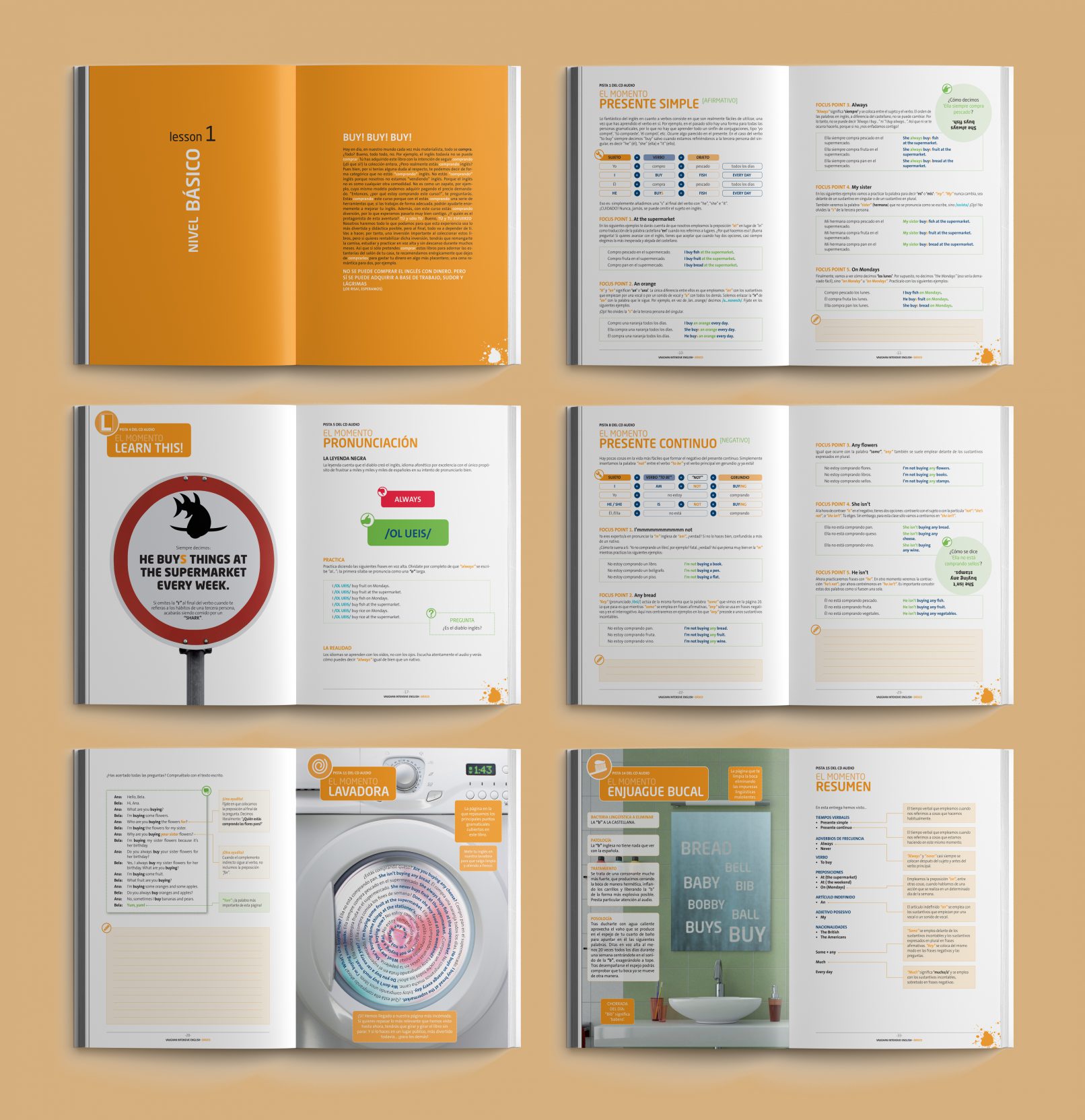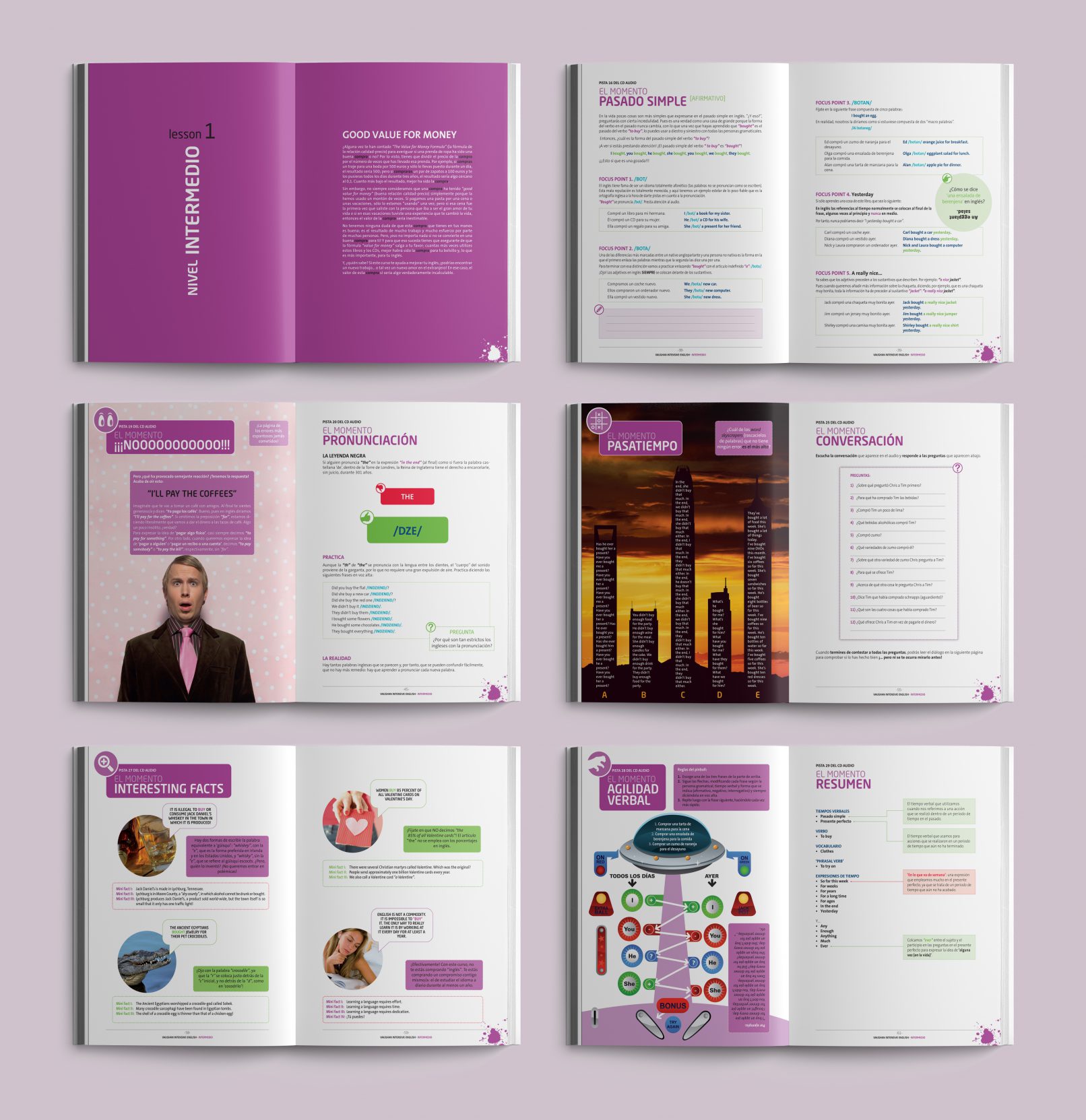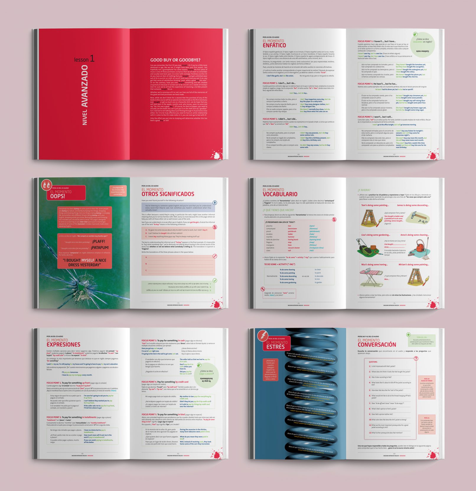 Para los interiores, divididos en esos tres niveles, que hemos diferenciado por colores –naranja, morado y rojo–, diseñamos unas dobles páginas de gramática buscando el máximo orden, y otras dobles más lúdicas, que contienen desde errores típicos a pasatiempos, hechos interesantes, etc.