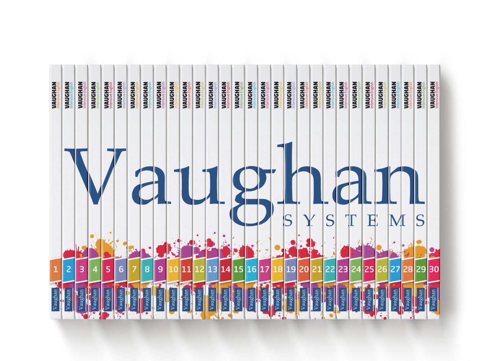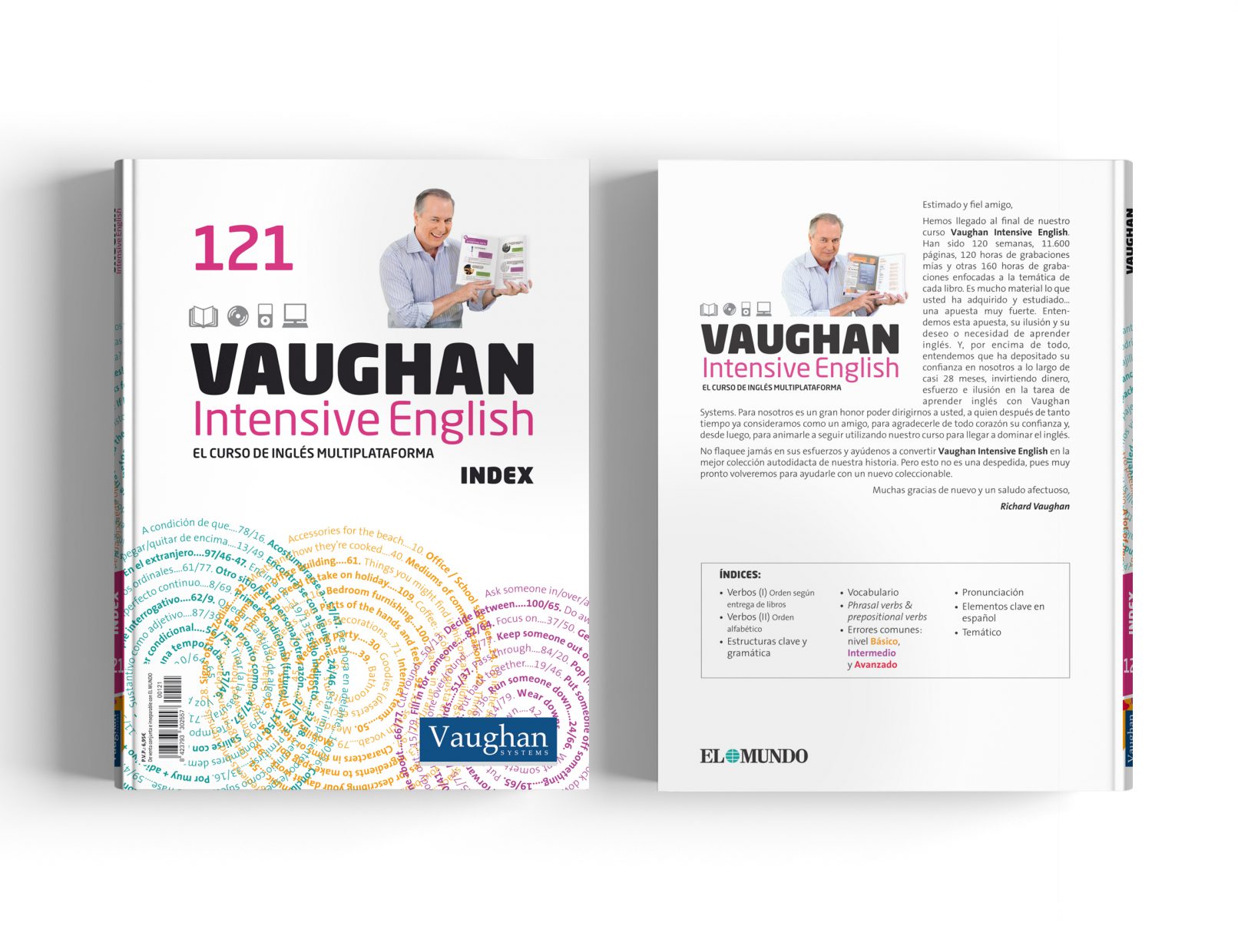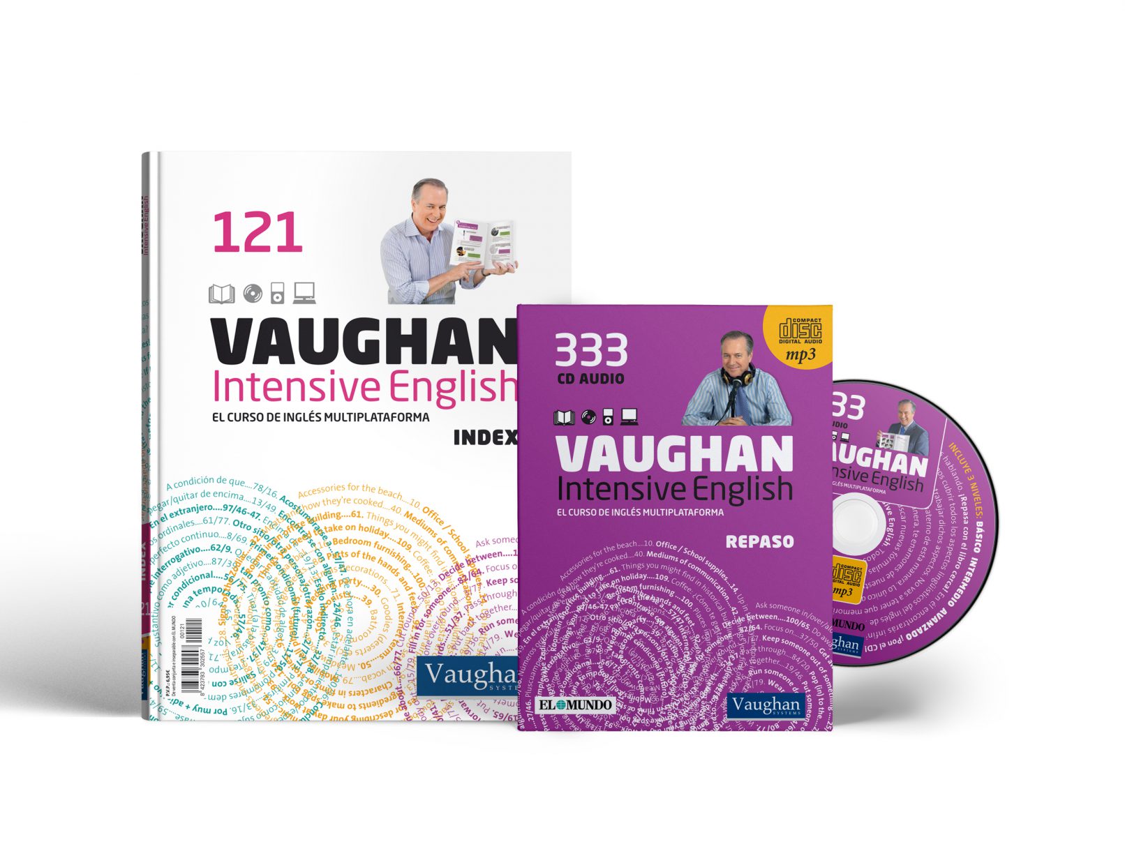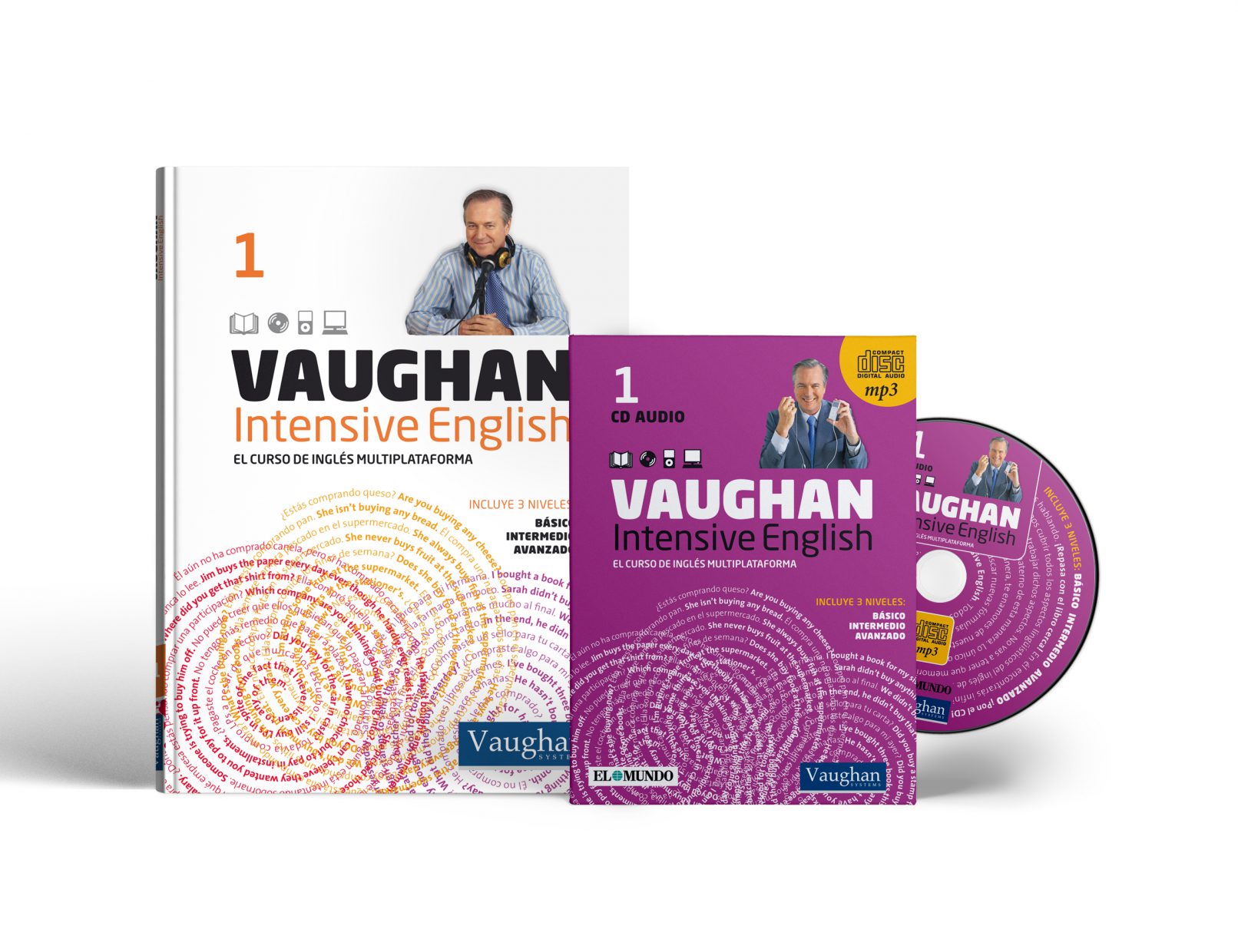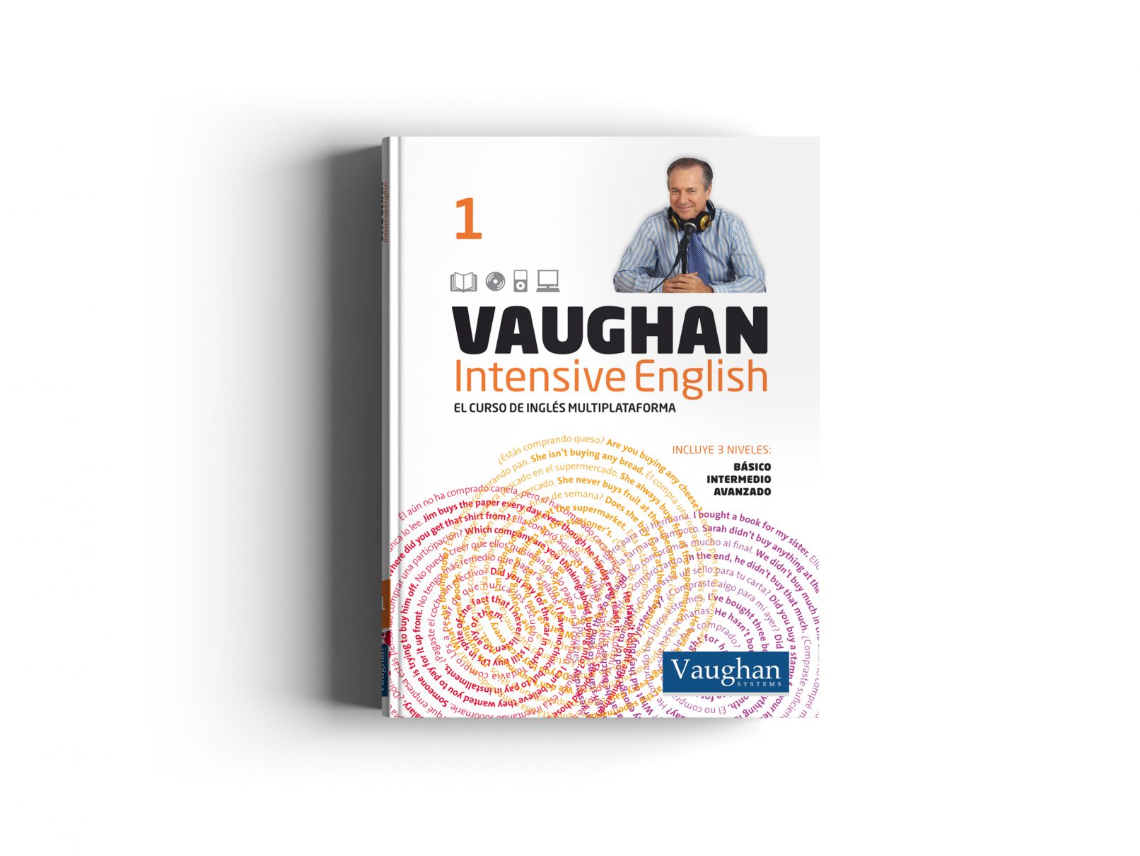 En las cubiertas aparece el creador de Vaughan Systems, como garante del contenido, el título de la colección y tres espirales (una por cada nivel de aprendizaje) con frases que se estudian en el interior. El orden compositivo y el fondo blanco transmiten la sensación de que estamos ante un curso de idiomas eficaz y accesible.