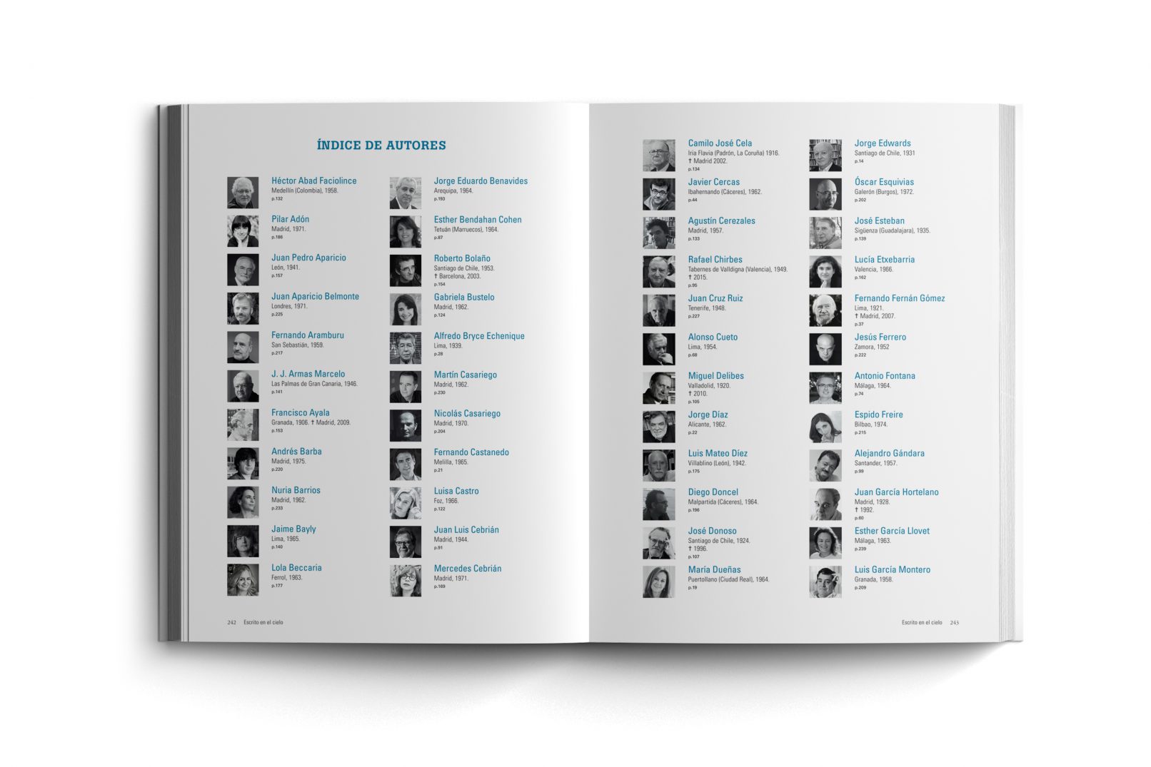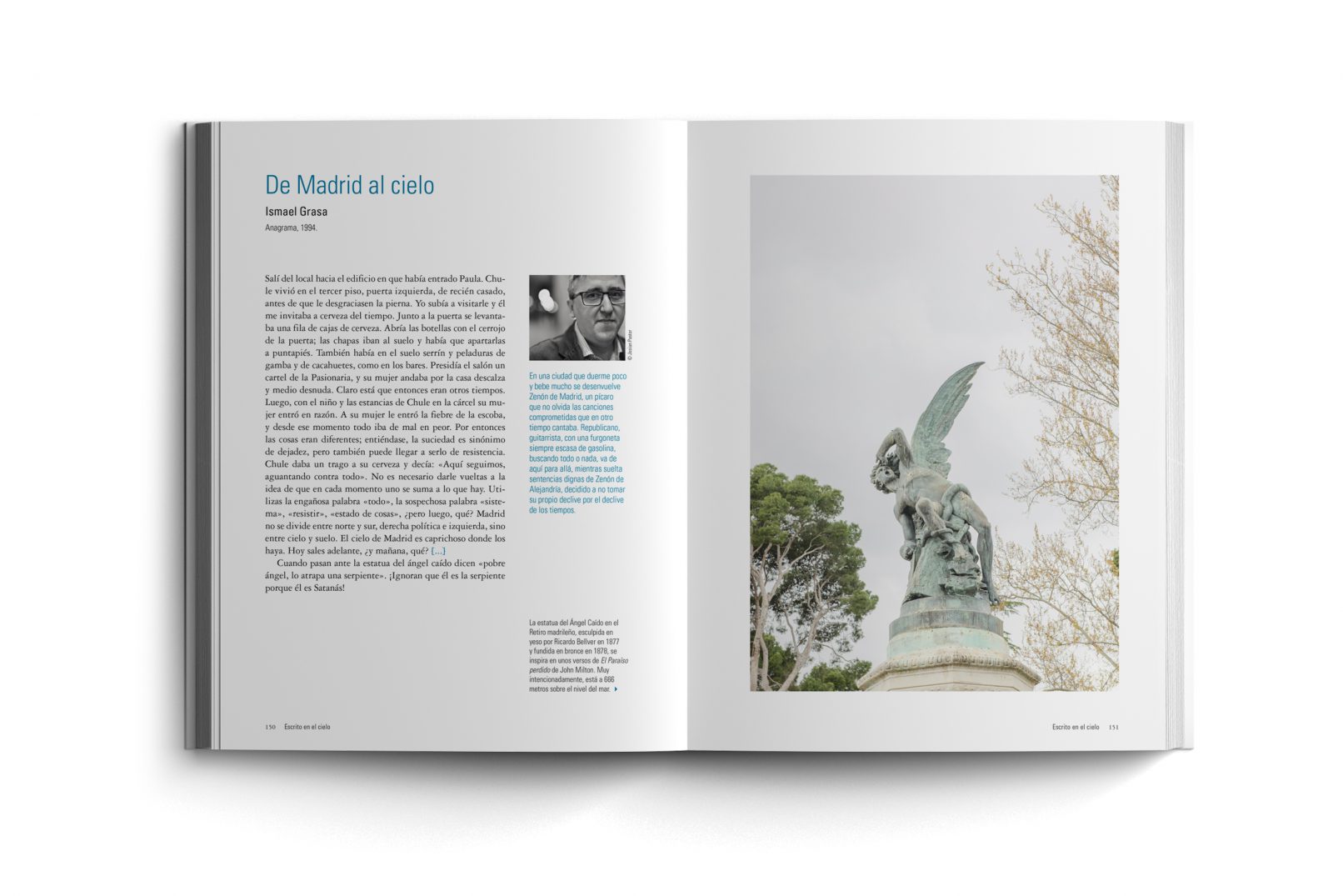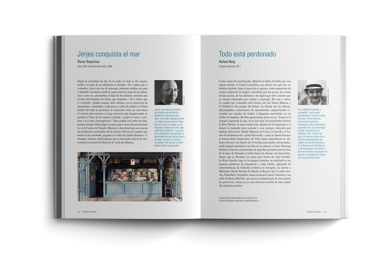Para ello decidimos que los fragmentos, breves, se ordenaran cronológicamente según lo que contaran, y que se presentaran todos siguiendo un mismo esquema gráfico y de contenidos (fragmento narrativo, texto de apoyo, fotografía del autor y muchas veces fotografía de contexto con su correspondiente pie de foto, para dar el mayor protagonismo a la ciudad). En el diseño buscamos la claridad y la limpieza, jugando con una segunda tinta azul que en cierto modo evocara el cielo. Por contenido, formato, impresión y encuadernación Escrito en el cielo es uno de esos objetos que cualquier aficionado a la lectura sabe apreciar.