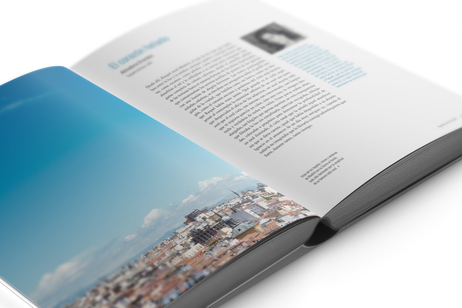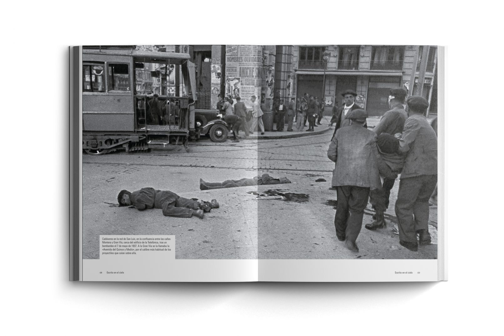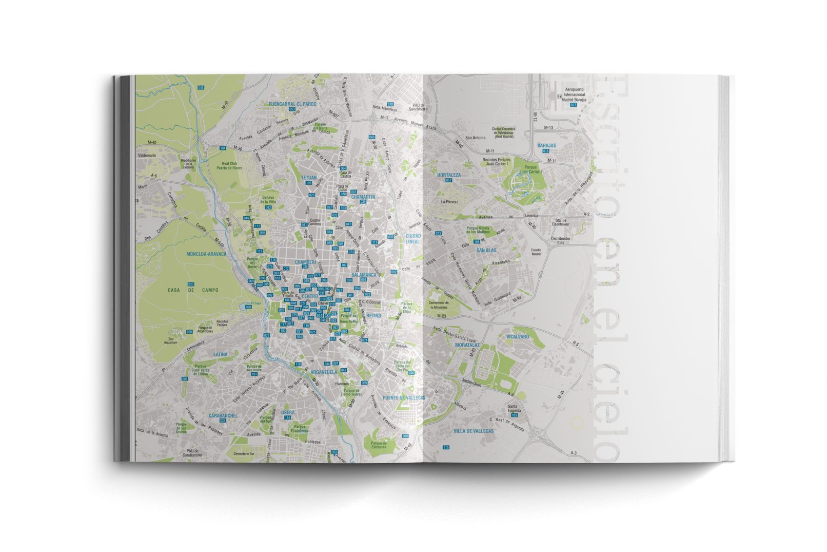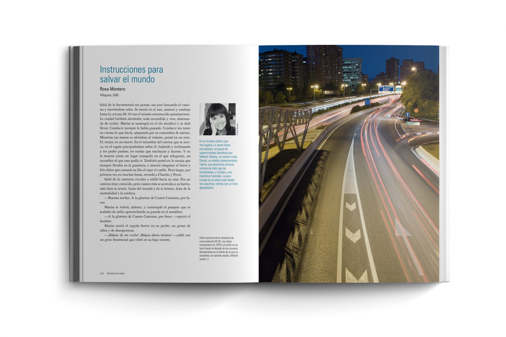 Para ello decidimos que los fragmentos, breves, se ordenaran cronológicamente según lo que contaran, y que se presentaran todos siguiendo un mismo esquema gráfico y de contenidos (fragmento narrativo, texto de apoyo, fotografía del autor y muchas veces fotografía de contexto con su correspondiente pie de foto, para dar el mayor protagonismo a la ciudad). En el diseño buscamos la claridad y la limpieza, jugando con una segunda tinta azul que en cierto modo evocara el cielo. Por contenido, formato, impresión y encuadernación Escrito en el cielo es uno de esos objetos que cualquier aficionado a la lectura sabe apreciar.