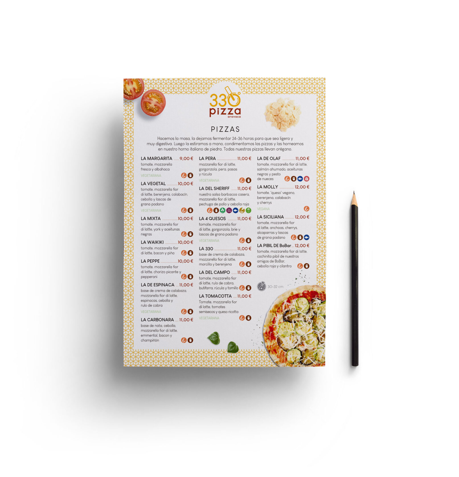 330º Pizza nos encargó un flyer para anunciar su menú y repartirlo por el barrio y entre sus clientes.