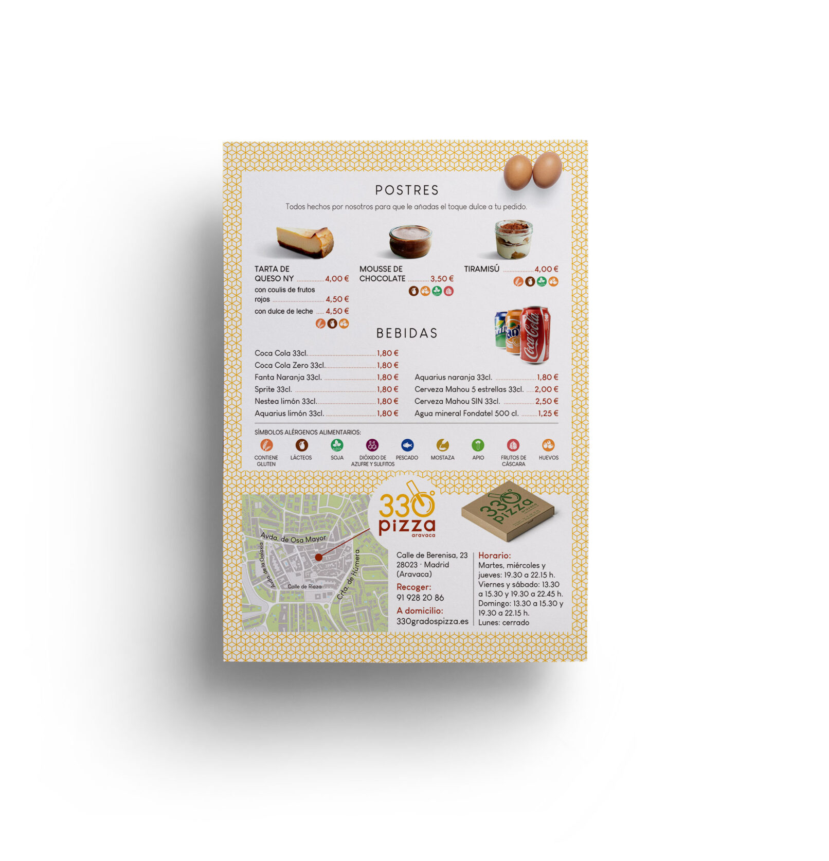 Elegimos un formato A5 y diseñamos una cenefa que recuerda el empapelado de la pared del local. Nos decantamos por siluetear los productos, pues el cliente quería un flyer luminoso, y por intentar que quedase lo más sencillo y limpio posible, teniendo en cuenta la cantidad de información que teníamos que dar (menú, alérgenos y localización de la pizzería así como horarios y métodos de pedido).