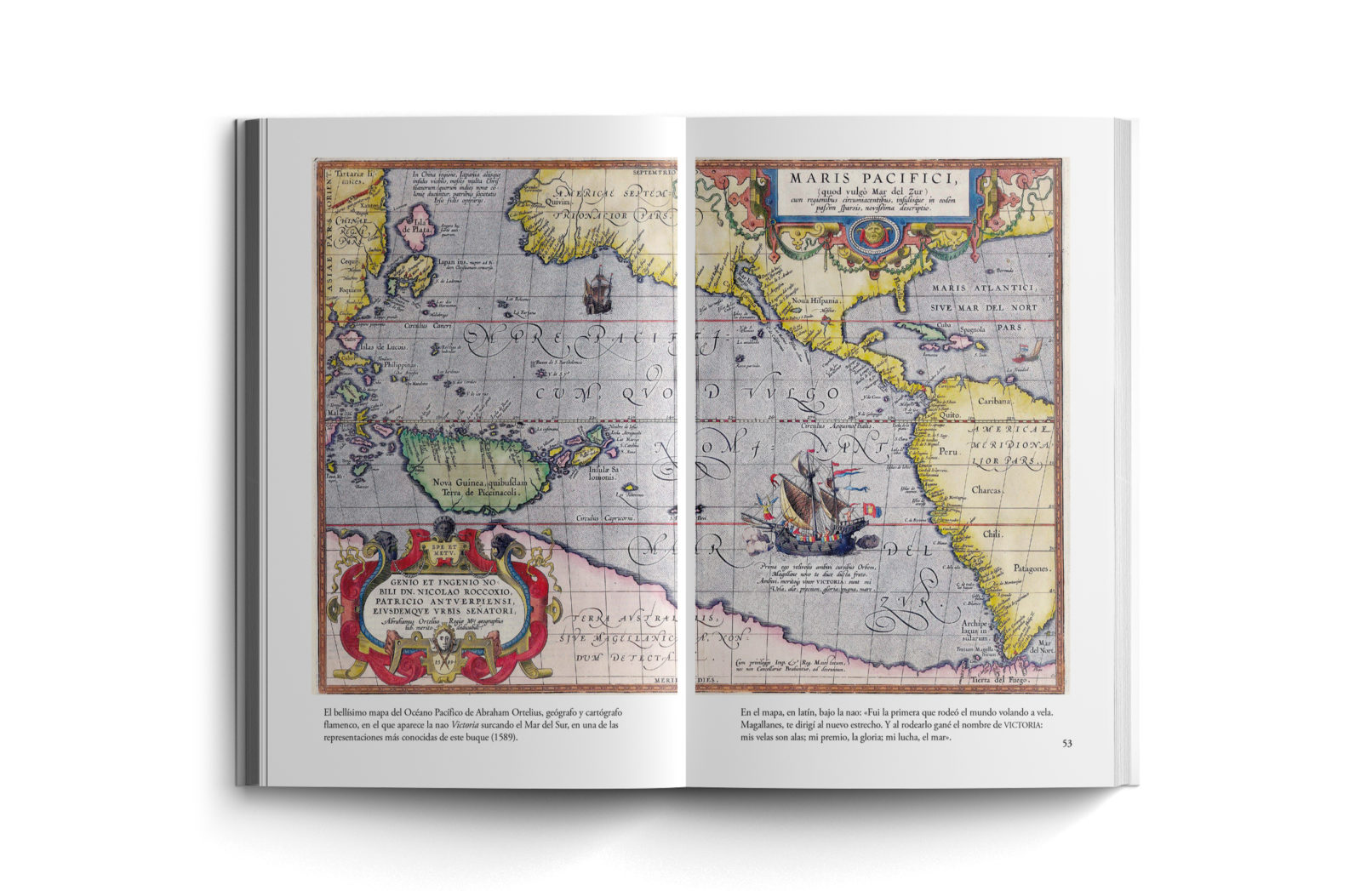 Por encargo del cliente, y con toda lógica, dado el contenido del libro, el diseño fue muy clásico, tratando en todo momento de favorecer la lectura. Como la impresión era 4/4, usamos un segundo color, un muy poco estridente azul, para los títulos y otros elementos sobre los que se quería llamar la atención. En la cubierta se eligió otro azul, aún más suave, para un fondo sobre el que se dispuso la abundante información editorial, y un bello mapa de la época, un buen exponente de aquel momento emocionante en el que iban de la mano el crecimiento del saber y la expansión del mundo conocido.